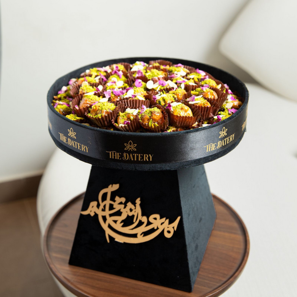 تحتوي على كيلو من التمر السكري الفاخر بحشوتنا الخاصة من مكوناتها البسكويت و مغطى بالصوص و المكسرات و الورد (التمر الملكي)